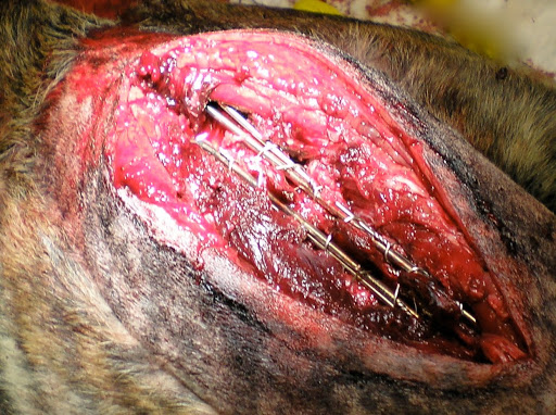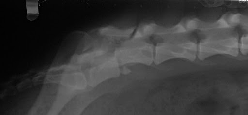 Σκύλος προσκομίστηκε στο Κτηνιατρικό Κέντρο Ιλισίων μετά από τροχαίο ατύχημα. Διαπιστώθηκαν εξάρθρημα ισχίου, κάταγμα ηβοισχιακής σύμφυσης, εξάρθρημα μεταξύ έκτου καί έβδομου οσφυϊκών σπονδύλων καί κατάγματα ακανθώδους απόφυσης καί κάτω οπίσθιας γωνίας σώματος έκτου οσφυϊκού σπονδύλου. Λίγες ημέρες μετά το ατύχημα εμφανίστηκαν αταξία καί απώλεια των αντανακλαστικών θέσης των οπισθίων άκρων καθώς και αδυναμία κίνησης της ουράς. Παρακάτω φαίνονται οι ακτινογραφίες του εξαρθρωμένου ισχίου πρίν και μετά την κλειστή ανάταξη, οι ακτινογραφίες της σπονδυλικής στήλης πρίν και μετά τη χειρουργική επέμβαση (τροποποιημένη τμηματική νωτιαία σταθεροποίηση) και τα εμφυτεύματα αμέσως μετά την ολοκλήρωση της τοποθέτησής τους και λίγο πριν την έναρξη συρραφής του χειρουργικού τραύματος.