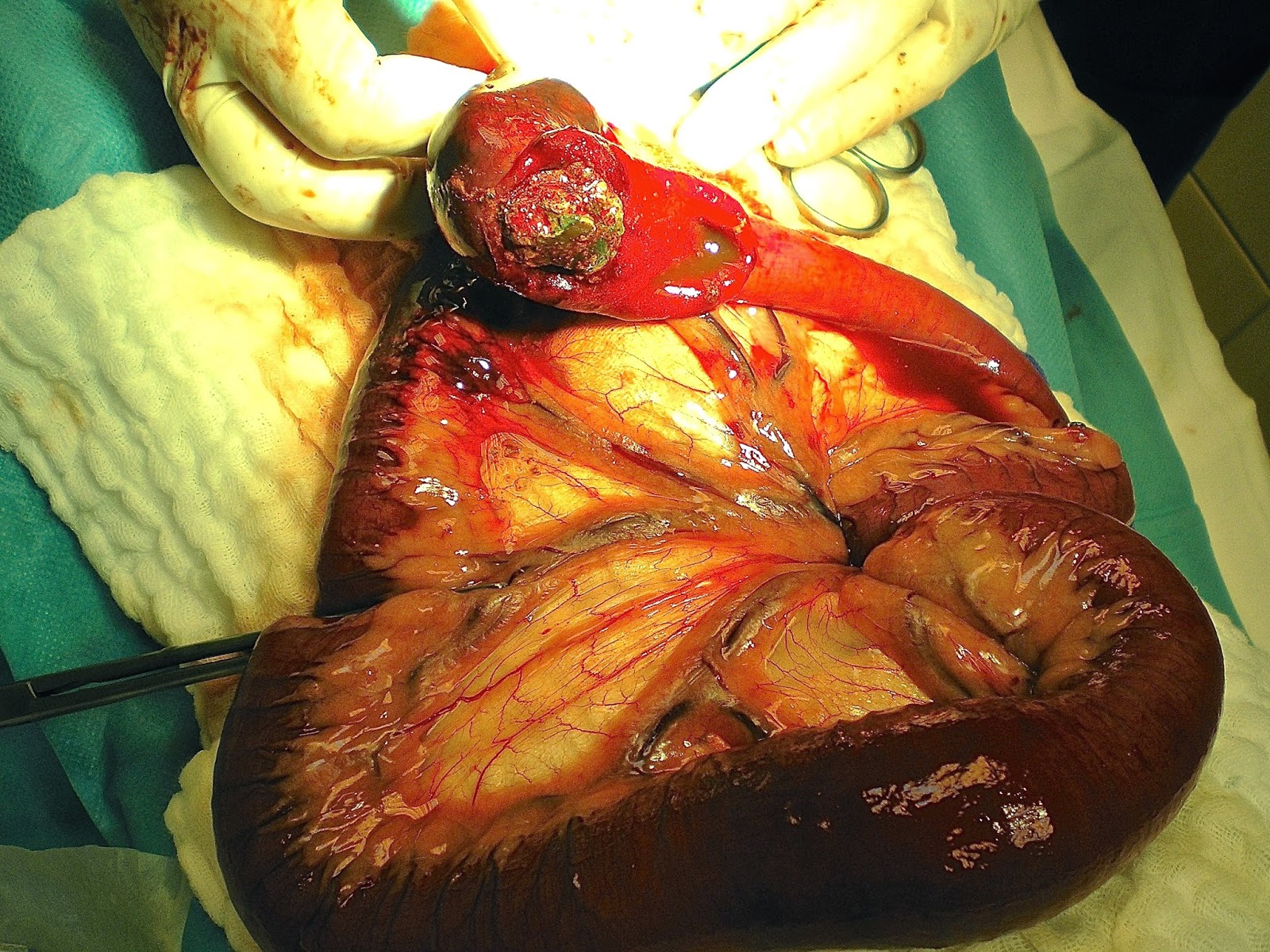 | Νεκρωμένο τμήμα (μελανό) του εντέρου, το οποίο εκτάμνη, και το αφαιρεθέν μπαλάκι |